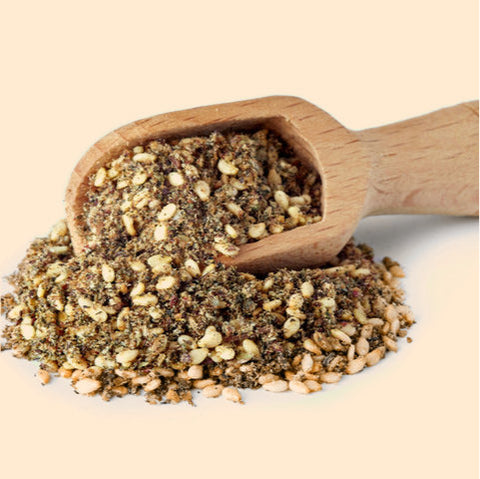 Cet assaisonnement très utilisé au Moyen-Orient est traditionnellement composé de thym, sumac, graines de sésame grillées et sel. Il existe plusieurs variantes selon les pays. On peut lui ajouter d'autres épices telles que la coriandre, le cumin ou du piment. Bien sûr, mon préféré est le Zaatar de mon pays d'origine, le Liban!