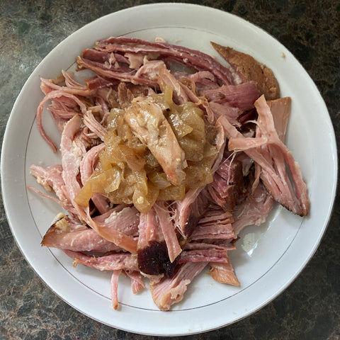 Servir avec des pommes de terre en purée ou des nouilles. Congeler les restes du jambon avec son jus dans des contenants hermétiques.