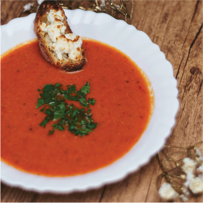 Facultatif: Garnir des tranches de pain avec le fromage Feta et les griller au four jusqu’à ce que le fromage fonde puis déposer une tranche de pain dans chaque bol de soupe, garnir avec le persil ou l’origan et servir
